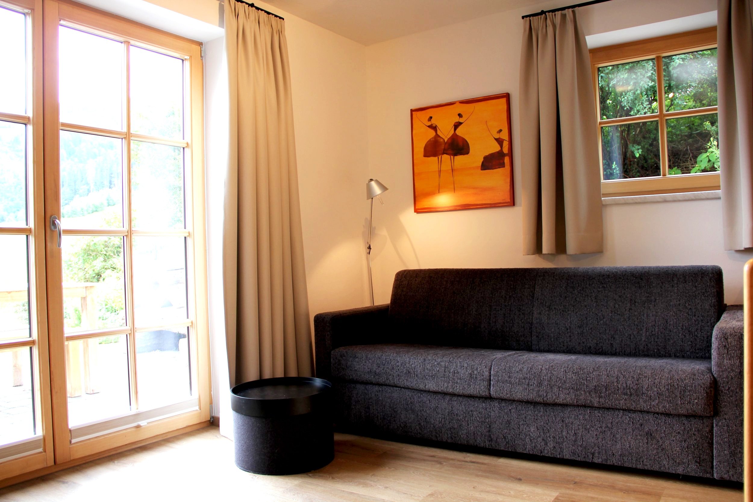 Türen auf und raus ins Grüne. Unser ebenerdiges Appartement mit Terrasse bietet den perfekten Rückzugsort für einen entspannten Urlaub. Die Wohnung verfügt über ein Schlafzimmer mit Doppelbett und einer top ausgestatteten Wohnküche. Diese beeindruckt nicht nur durch ihre moderne Einrichtung, sondern auch durch den großen Essbereich, der genügend Platz für gemeinsame Mahlzeiten und lustige Spielabende bietet. Zusätzlich steht eine komfortable Schlafcouch zur Verfügung. Die Terrasse lädt zum Entspannen im Freien ein und bietet einen schönen Ausblick auf die umliegende Natur. Das Appartement ist die ideale Wahl für deinen Familienurlaub mit Hund.